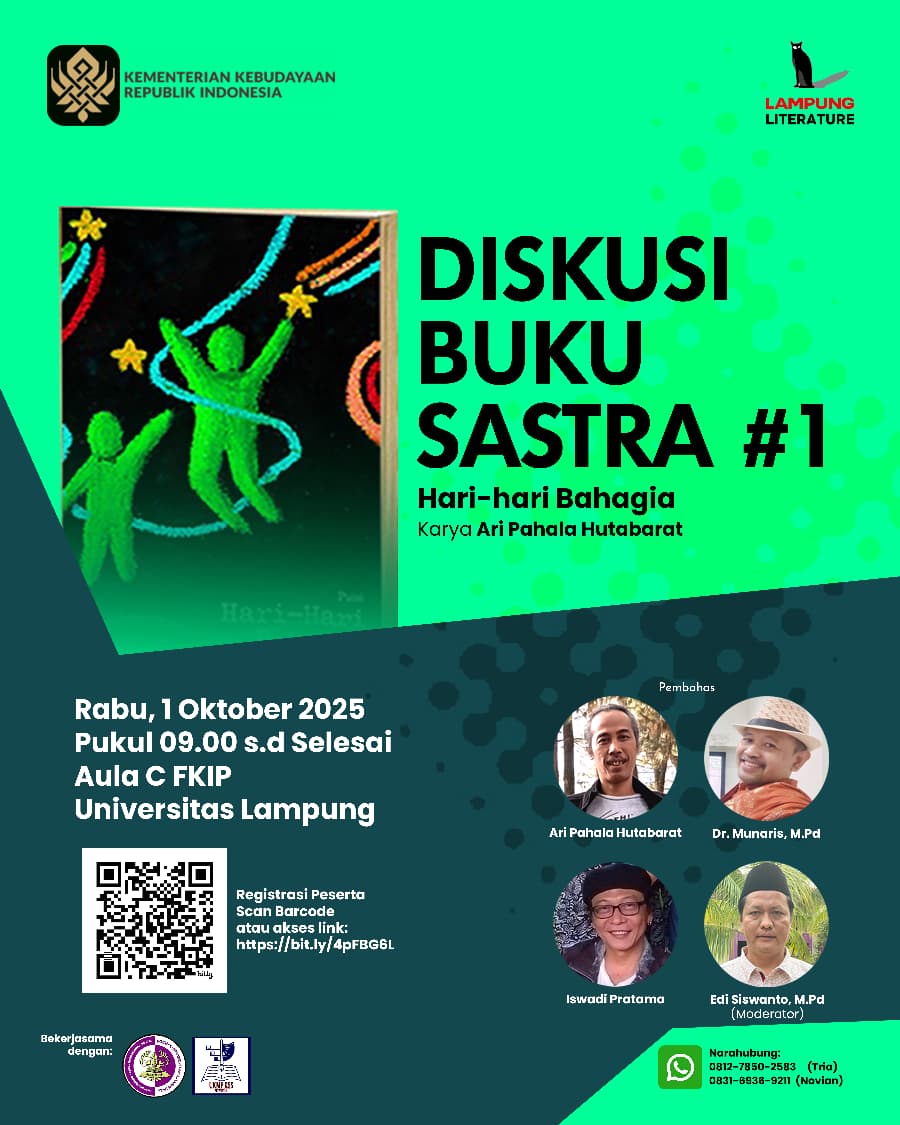 Bandar Lampung (terdidik.id) — Lampung Literature bersama Kementerian Kebudayaan RI menggelar Diskusi Sastra #1 bertema “Puisi dan Prosa di Era Digital”, Rabu, 1 Oktober 2025. Acara ini berkolaborasi dengan UKMF KSS Universitas Lampung (Unila) dan HMJ PBS FKIP Unila, dengan menghadirkan diskusi buku puisi Hari-hari Bahagia karya Ari Pahala Hutabarat.
