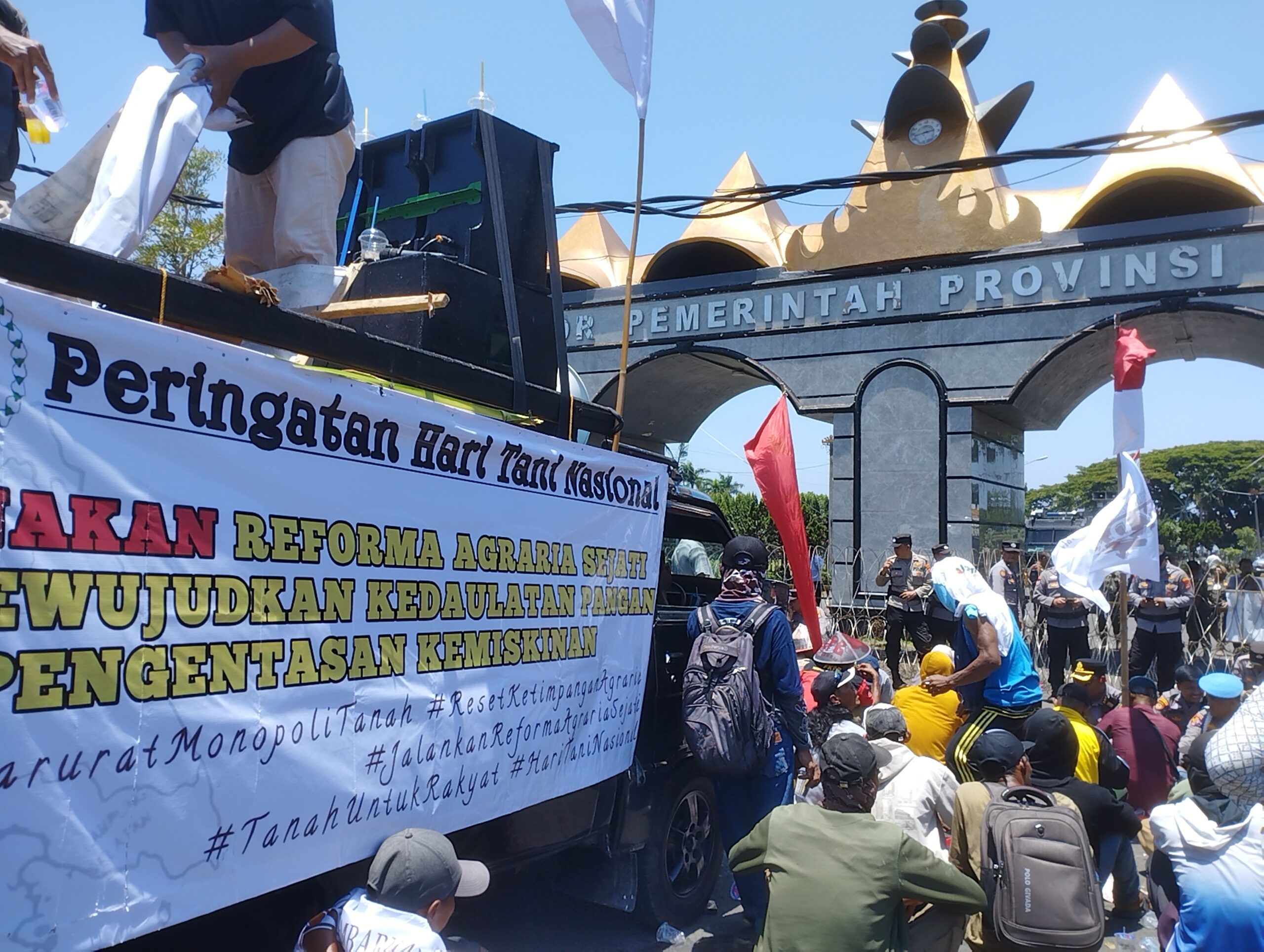 “Bahkan banyak petani yang sudah tidak punya lahan sama sekali, akhirnya hanya jadi buruh atau menyewa tanah. Padahal tanah di Lampung luas, tapi kebanyakan dikuasai pengusaha besar seperti perkebunan tebu di Lampung Tengah,” ungkap Agus saat aksi di depan Kantor Pemprov Lampung.